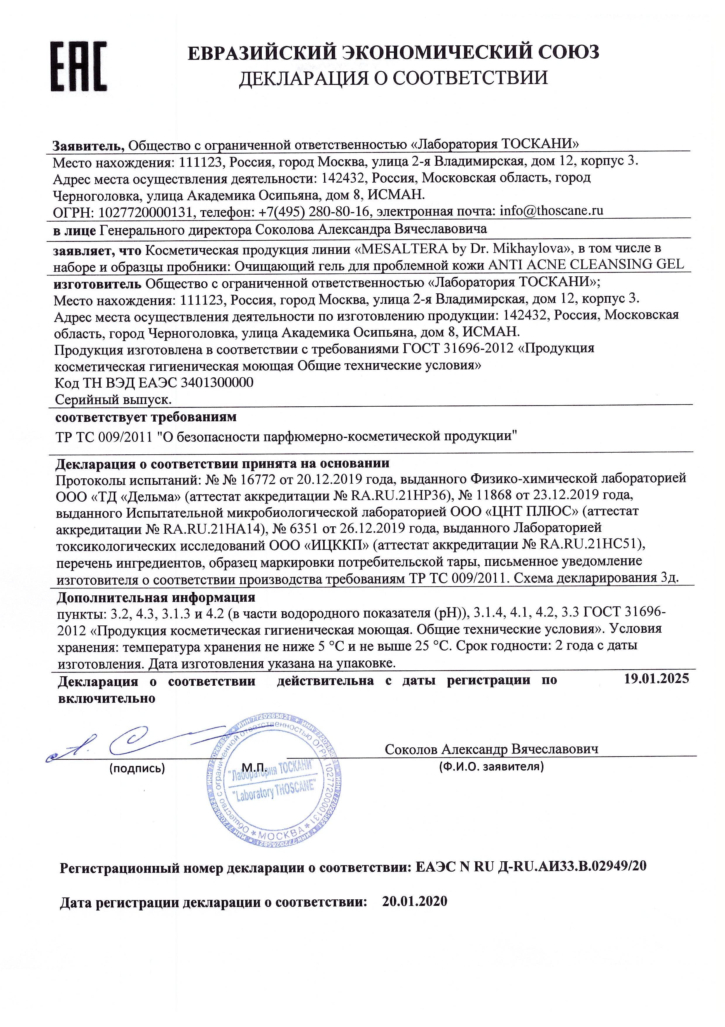 Вес: 230 г Тип: Гель Бренд: Mesaltera by Dr. Mikhaylova Применение: Для лица Форма выпуска: Флакон Объем: 200мл Использование: Домашний уход