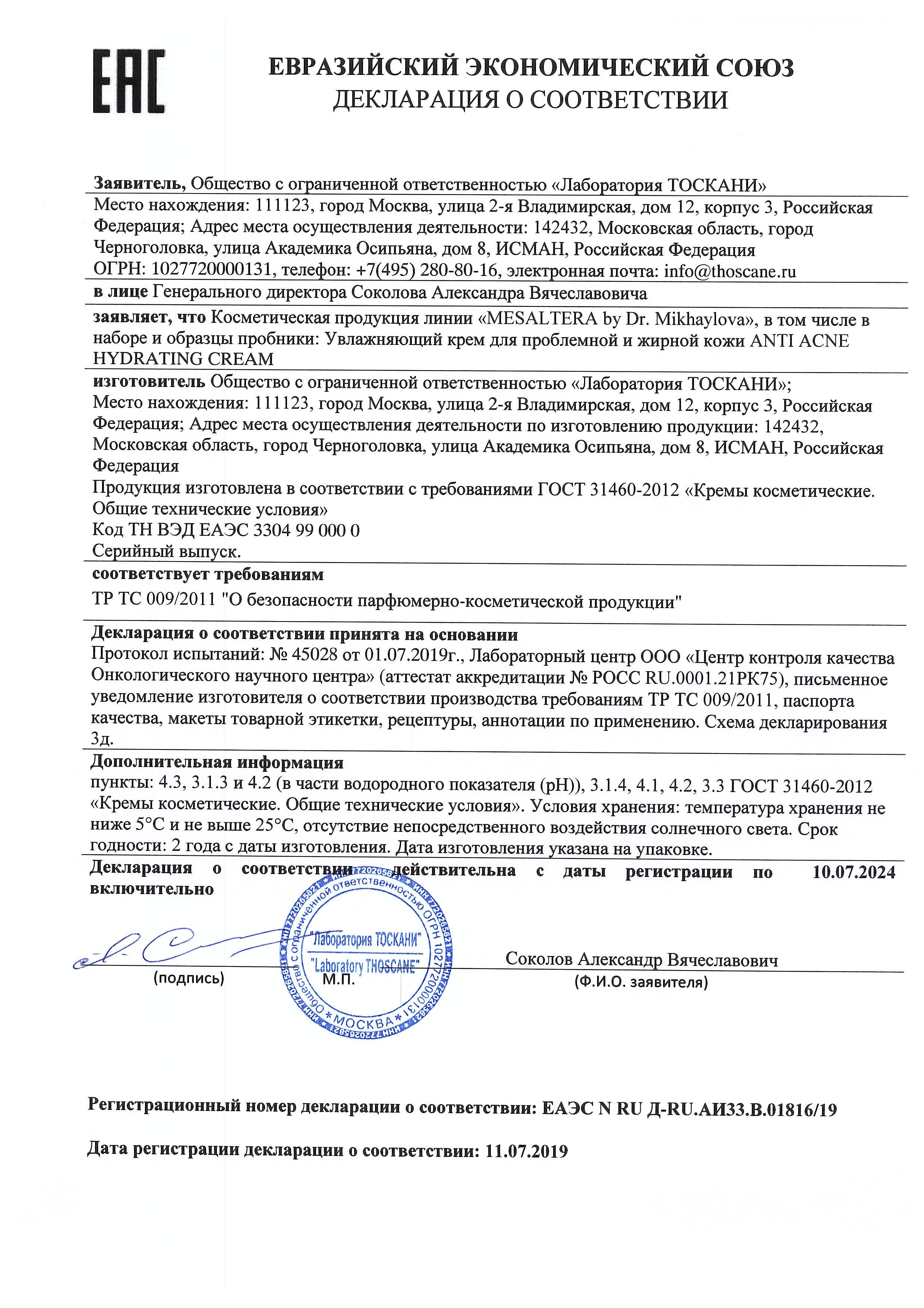 Mesaltera ANTI-ACNE HYDRATING CREAM/ Анти Акне Гидратинг Крем, 50 мл Увлажняющий крем для проблемной и жирной кожи